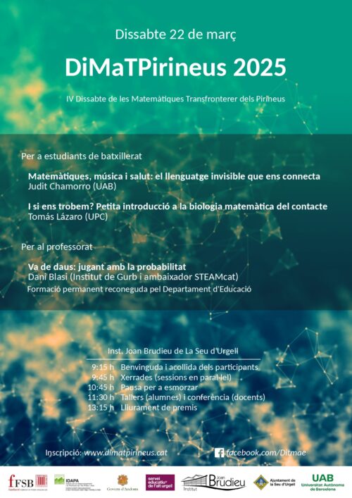 El Dissabte de les Matemàtiques Transfronterer dels Pirineus es tracta d’una activitat innovadora de matemàtiques que es realitzarà per quart cop a l’Alt Pirineu el 22 de Març del 2025 a l’Institut Joan Brudieu de la Seu d’Urgell.