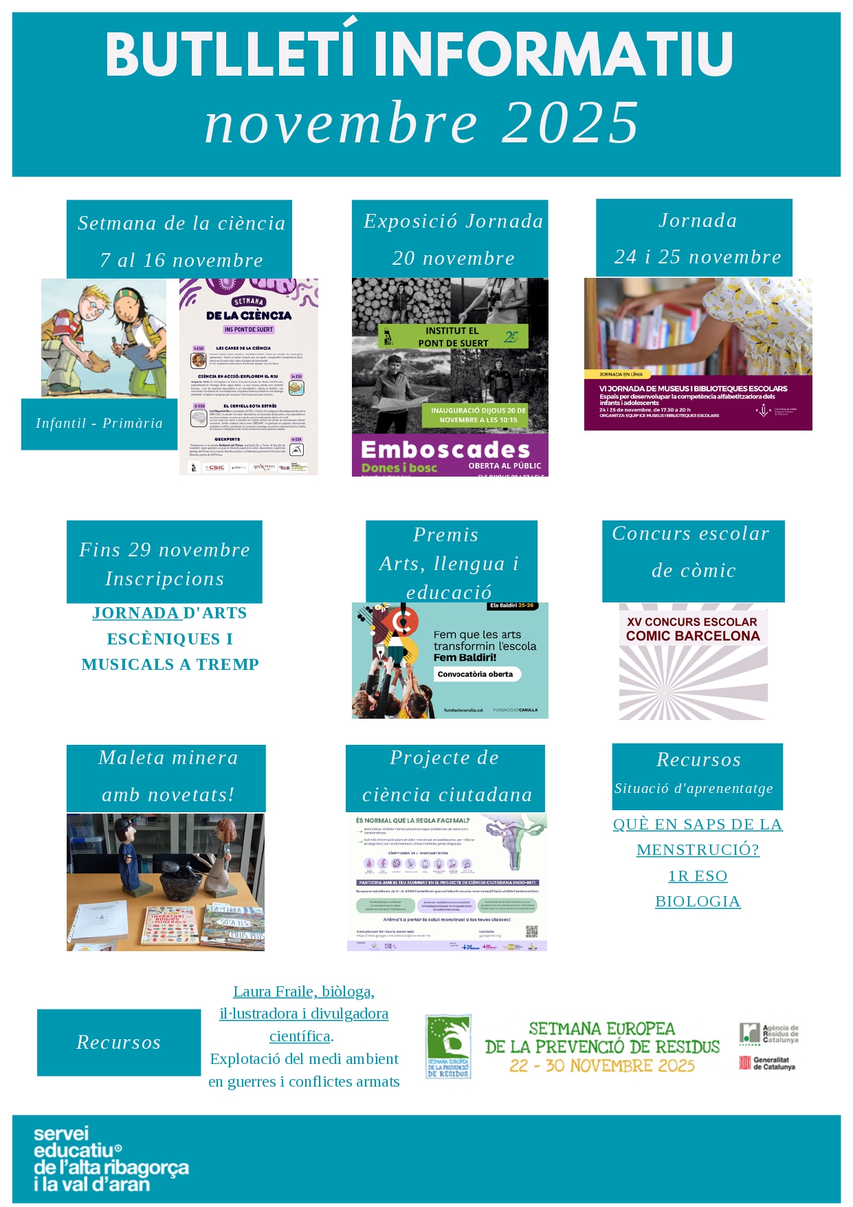 Presentem l’oferta actualitzada d’activitats i tallers de ciències socials, naturals i tecnologia disponibles a la comarca. Les propostes formatives estan impulsades pel Camp d’Aprenentatge, el Parc Nacional, el Consell Comarcal, els Agents Rurals i l’alumnat dels Cicles Formatius de l’Institut del Pont de Suert. L’objectiu és facilitar l’accés a la informació i donar a conèixer totes les activitats disponibles perquè els docents les pugueu conèixer i sol·licitar. Podeu filtrar per agent, curs a qui va dirigida l’activitat, durada…