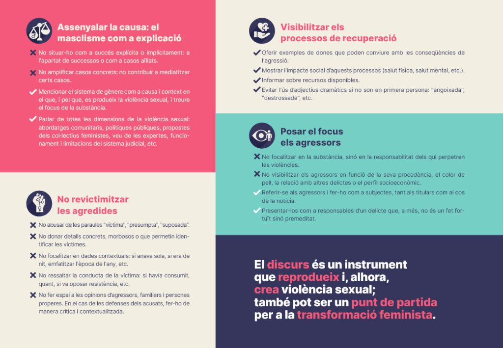 En aquesta guia, basada en el recent “Diagnòstic sobre informacions mediàtiques al voltant de les violències sexuals, l’ús de drogues i la submissió química“, es proposen noves conceptualitzacions del que fins ara es coneix com a “violències sexuals sota submissió química”, s’evidencien mites detectats en nombroses narratives mediàtiques i es contrasten amb les realitats d’aquesta violència i, per últim, s’ofereixen alguns tips útils per a informar amb qualitat i perspectiva crítica i feminista sobre aquest fenomen estructural de gènere, així com recursos i bones pràctiques.