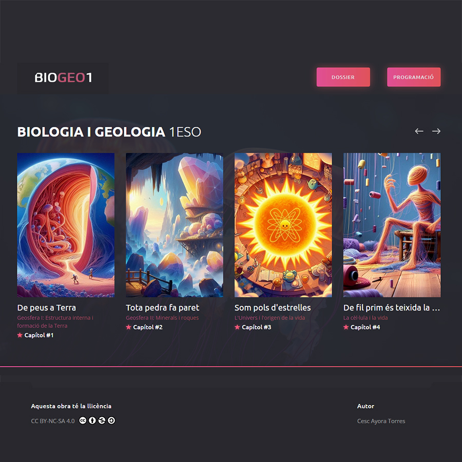 Per a 1r d’ESO proposa una sèrie de capítols dissenyats com una seqüència didàctica: cada capítol inclou una presentació narrada i un dossier d’activitats competencials, pensades per afavorir la comprensió dels continguts.