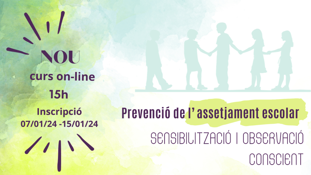 Programa formatiu per a la prevenció de l’assetjament escolar. (2 cursos) En línia.  Primer curs Prevenció de l’assetjament escolar: Sensibilització i observació conscient, és un curs introductori sobre el concepte d’assetjament, la diferència entre conflicte, violència i agressivitat, i entra en dues de les tres estratègies preventives que són la sensibilització i l’observació conscient.