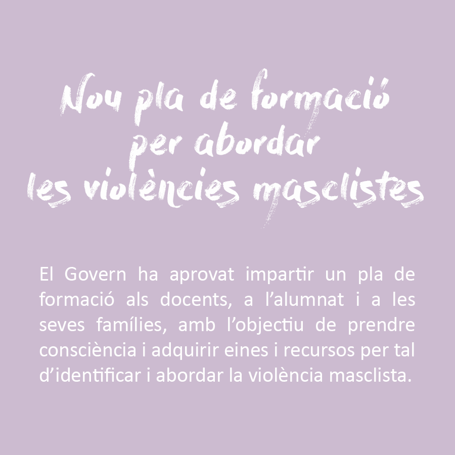 El Govern ha aprovat 32 accions per erradicar les violències masclistes, impulsades pel Departament d’Igualtat i Feminisme. És un conjunt d’accions transversals, en què participen la resta de departaments de la Generalitat, i que plantegen un abordatge integral de les violències masclistes. Un parell de les accions aprovades es portaran a terme dins l’àmbit educatiu: