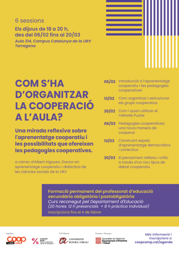 Aquest programa formatiu pioner, que neix de la col·laboració de l’Ateneu Cooperatiu del Camp de Tarragona -CoopCamp- amb la Universitat Rovira i Virgili (URV) ofereix als docents una revisió crítica de l’Aprenentatge Cooperatiu conegut fins ara. Aquesta formació combina teoria i pràctica, promovent un procés de reflexió i desenvolupament continu per als professionals de l’educació