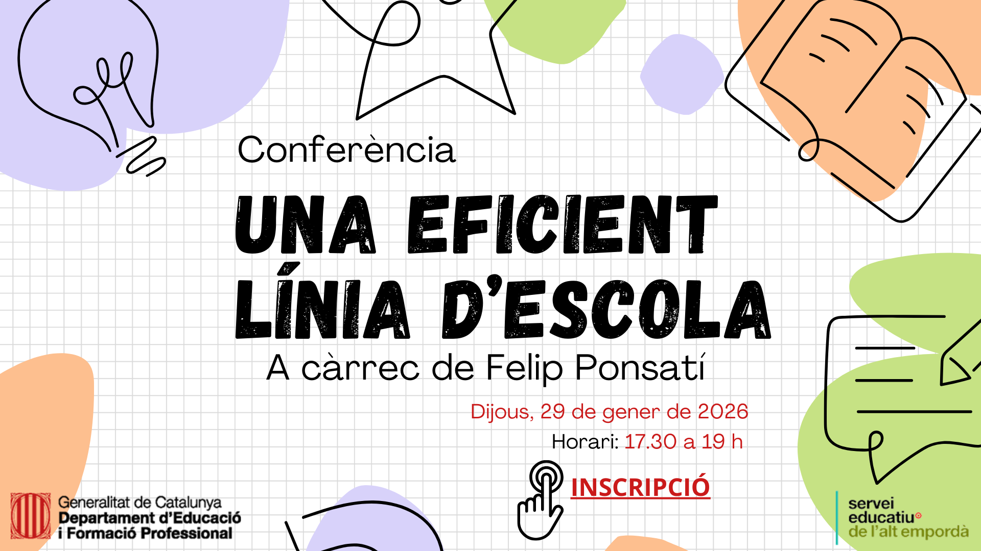 Dijous 29 de gener, de les 17.30 a les 19 h, tindrà lloc la conferència Una eficient línia d’escola, a càrrec de Felip Ponsatí. Es farà al servei educatiu de l’Alt Empordà.