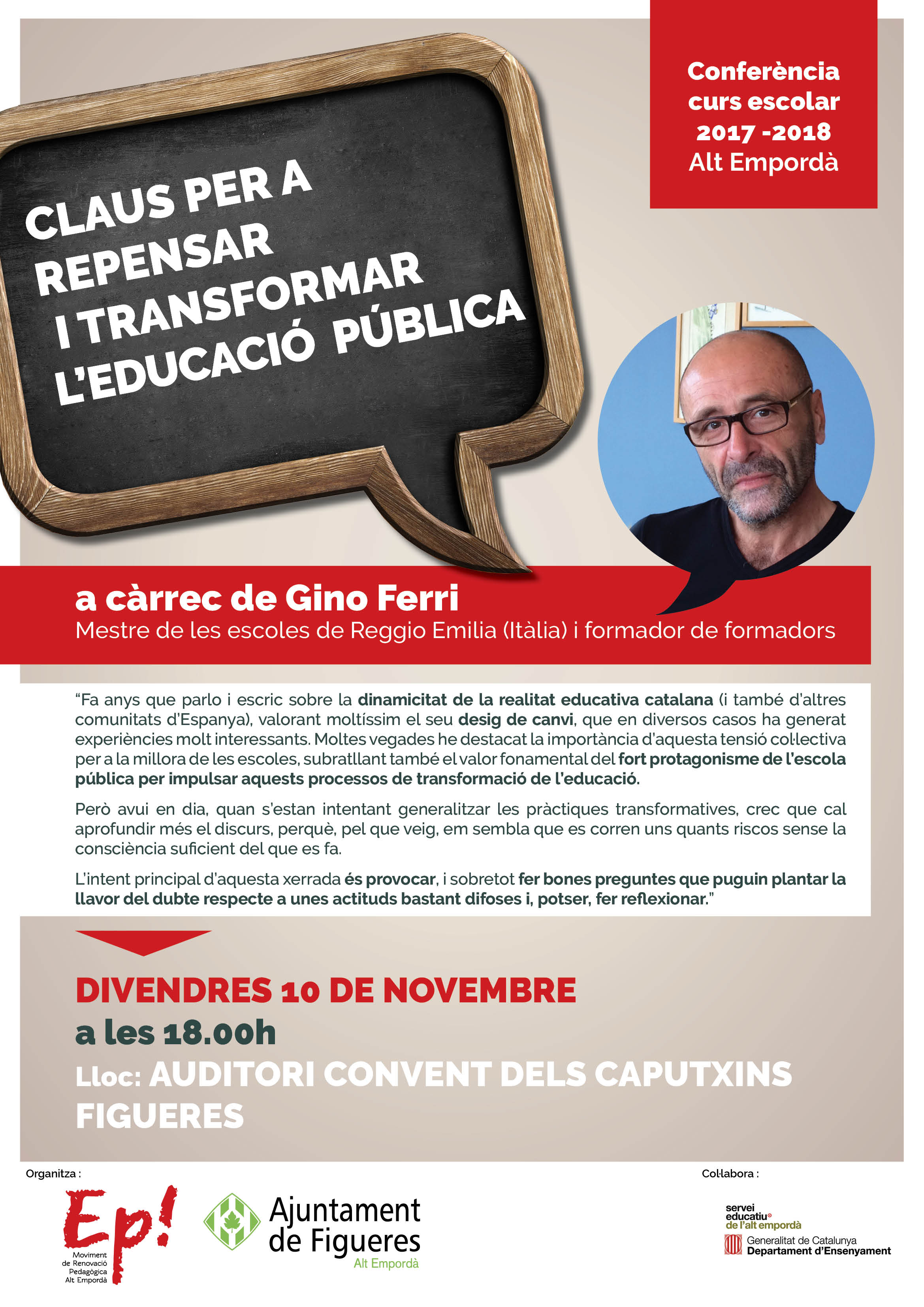 Espai destinat a recollir les diferents conferències d’inauguració del curs escolar que s’han realitzat al SE de l’Alt Empordà. Coorganitzades amb: EP! MRPAE (Moviment de Renovació Pedagògica de l’AE) i l’Ajuntament de Figueres.