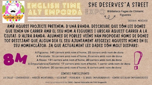 Us heu fixat mai que la nomenclatura dels carrers no és gens paritària? A Figueres hi ha 145 carrers amb nom d’home i 25 amb nom de dona, a Roses 131 versus 20, a Peralada no n’hi ha cap amb nom de dona, a Castelló/Empuriabrava només un i a Vilafant només 6 amb nom de dona i 20 amb nom d’home. Amb tot l’alumnat de 3r ESO s’ha treballat quines dones tenen un carrer dedicat i s’han fet uns pòsters que es poden trobar exposats a la biblioteca Fages de Climent de Figueres.