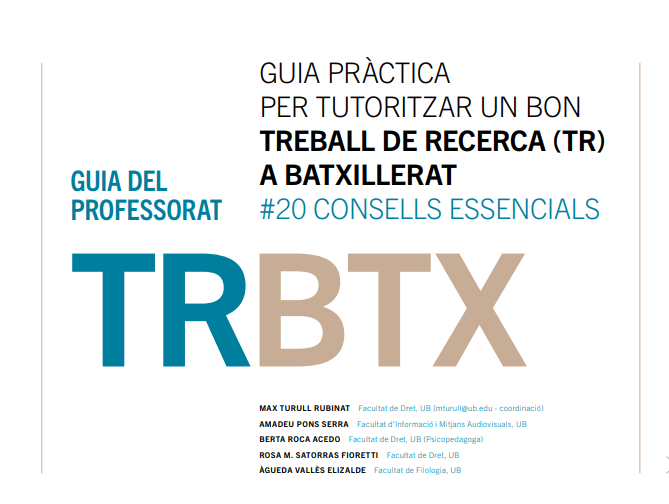 TURULL, M.; PONS, A.; ROCA, B. et al. Guia pràctica per TUTORITZAR un bon treball de recerca (TR) a batxillerat. #20 consells essencials. Guia del professorat: Barcelona. 2021. Aquesta guia va adreçada, sobretot, però no exclusivament, al professorat novell de secundària que no ha tingut una experiència d’investigació en el seu àmbit disciplinari més enllà dels treballs acadèmics que hagi pogut fer al llarg de la carrera […] http://hdl.handle.net/2445/179613