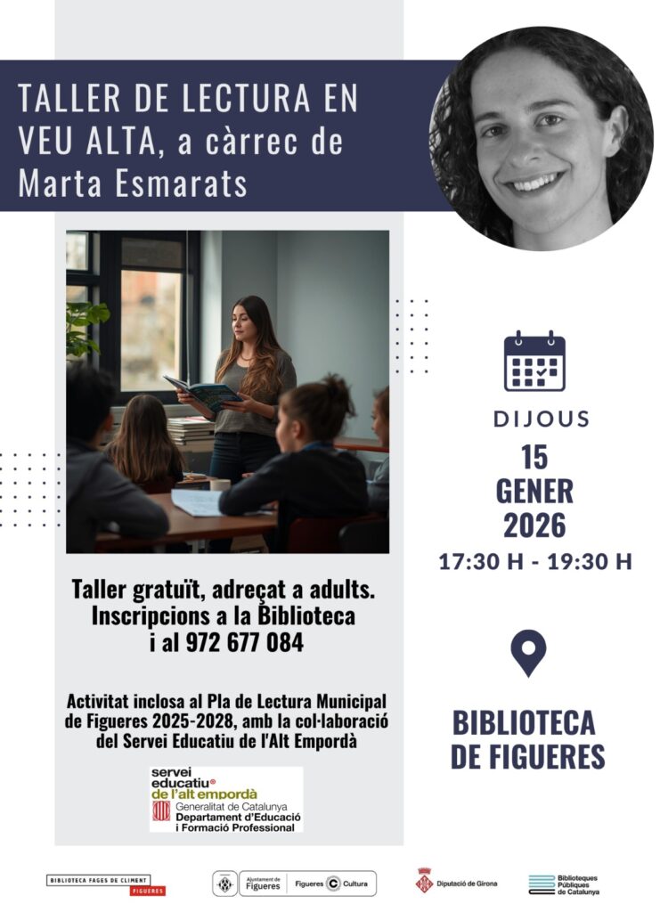 Des de la Biblioteca Pública de Figueres, s’ofereix un TALLER DE LECTURA EN VEU ALTA, a càrrec de la Marta Esmarats.