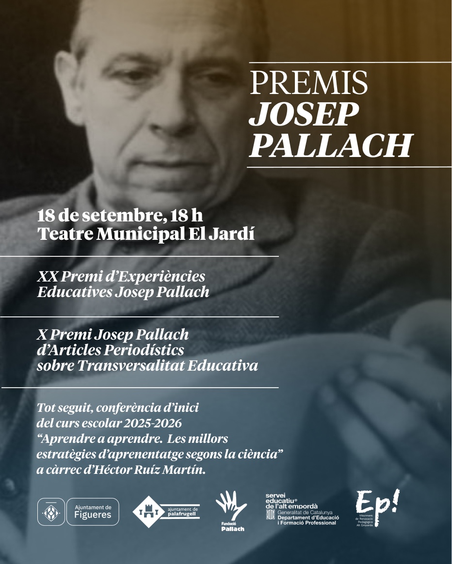 El dia 18 de setembre de 2025, a les 18h, al Teatre Municipal El Jardí de Figueres, es lliuraran els Premis Josep Pallach i tot seguit gaudirem de la conferència d’inici de curs: «Aprendre a aprendre. Les millors estratègies d’aprenentatge segons la ciència», a càrrec d’Héctor Ruiz.