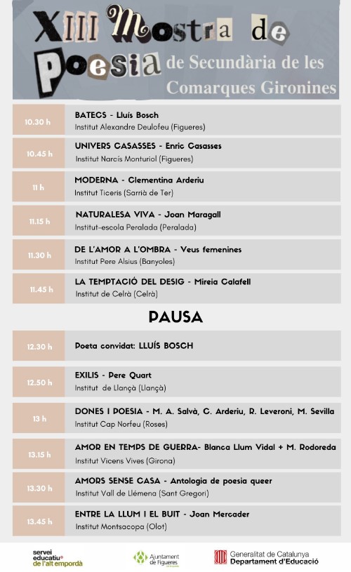 Mostra de Poesia a Secundària 2026Per Admin / 16/04/2026 / Mostra de poesia a secundària Portada / arts escèniques, Poesia Avui, 16 d’abril de 2026 se celebra la 13ena Mostra de Poesia de Secundària de les comaques gironines a la sala La Cate de Figueres.