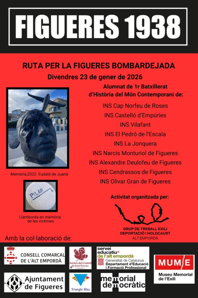 D’ençà les 8.30 fins a les 13.00 el nostre alumnat recorrerà, en grups, el centre de Figueres fent aturades en punts d’interès relacionats amb els bombardejos aeris de l’aviació feixista que va patir la ciutat entre el gener de 1938 i començaments de febrer de 1939, fins l’arribada i ocupació de les tropes franquistes i l’exili de milers de persones a la Catalunya Nord. Figueres, va ser de les ciutats catalanes que més van patir els bombardejos. Les víctimes, moltes anònimes, podien haver estat superior a les 400. Per això, historiadors com l’Enric Pujol ja l’han batejada, sense embuts, com “la Gernika Catalana”.