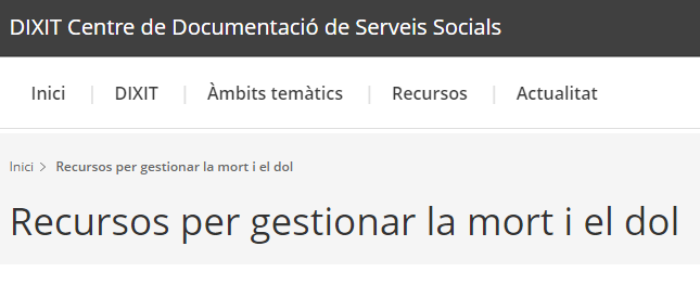 | Recursos per gestionar la mort i el dol Centre Documentació Serveis Socials DIXIT (Generalitat Catalunya)Recull variat de recursos que pretenen ajudar a les persones que estan passant per un procés de dol per la pèrdua d’una persona estimada. Aquest recull conté principalment monografies i articles relacionats amb el tema, però també recursos web i institucions que proporcionen suport psicològic i social a les persones que necessiten treballar la mort i el dol. Totes les monografies que es recomanen es poden consultar als centres DIXIT. |