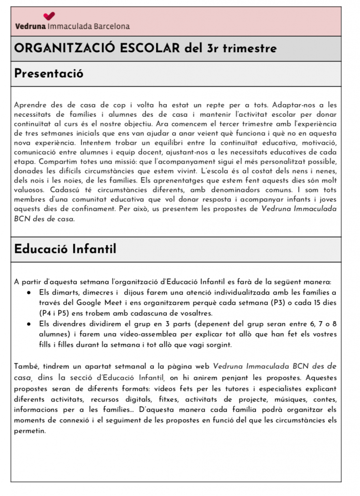 L’escola Vedruna Immaculada de Barcelona per a aquest 3r trimestre virtual, posa a disposició el material elaborat per si algun centre educatiu ho vol utilitzar/consultar.