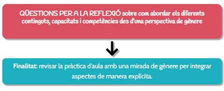 Els documents que s’ofereixen en aquest apartat del bloc de Coeduca’t, recullen una sèrie de preguntes que poden ajudar els docents i a les docents, a reflexionar i a qüestionar-se com abordar els diferents continguts, capacitats i competències des de la perspectiva de gènere, proporcionant possibles orientacions sense ànim de ser exhaustives. Les preguntes estan organitzades per àmbits curriculars i, dins cada àmbit, per capacitats (en el cas de l’educació infantil) i per competències (en el cas de l’educació primària i secundària obligatòria).