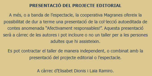 Per a més informació sobre l’espectacle, la presentació del projecte editorial i/o el taller sobre responsabilitat afectiva podeu adreçar-vos a info@magranes.com