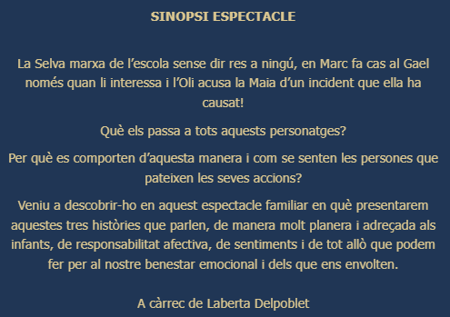 “Quan algú desapareix de la nostra vida i se’n va sobtadament sense acomiadar-se, això ens genera un malestar i sensacions desagradables. La història de la Selva, l’Àlex i la resta de companys/es ens mostra com ens podem sentir si ens trobem en una situació així, i ens fa pensar en com fer-ne una bona gestió emocional.”