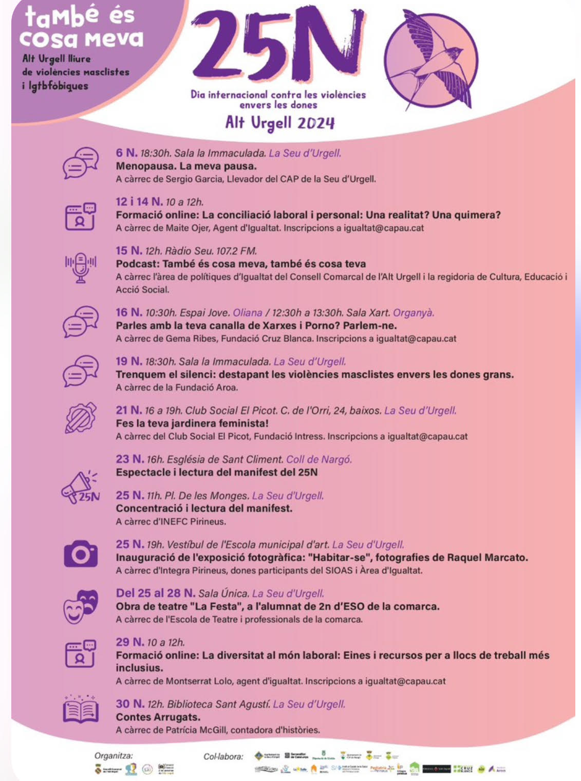 A banda, Igualtat Alt Urgell també ha programat durant les pròximes setmanes diversos tallers i activitats per conscienciar la ciutadania sobre les violències masclistes. Us deixem el programa: