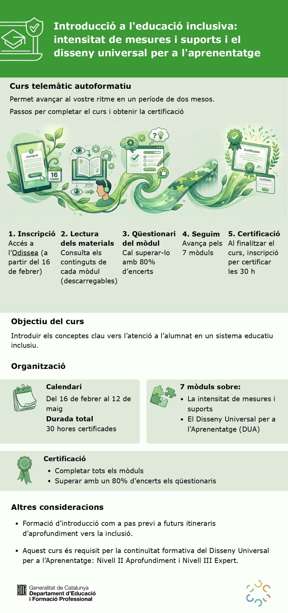 El eproper dilluns 16 de febrer s’iniciarà el curs autoformatiu Introducció a l’educació inclusiva: intensitat de mesures i suports i el disseny universal per a l’aprenentatge. Aquesta formació té com a finalitat oferir una introducció estructurada als fonaments de l’educació inclusiva, amb una mirada alineada amb els principis del Disseny Universal per a l’Aprenentatge (DUA) i amb els marcs normatius vigents en matèria d’equitat i atenció a la diversitat. El curs constitueix, alhora, el requisit imprescindible per accedir als itineraris d’aprofundiment en DUA Nivell II i Nivell III.