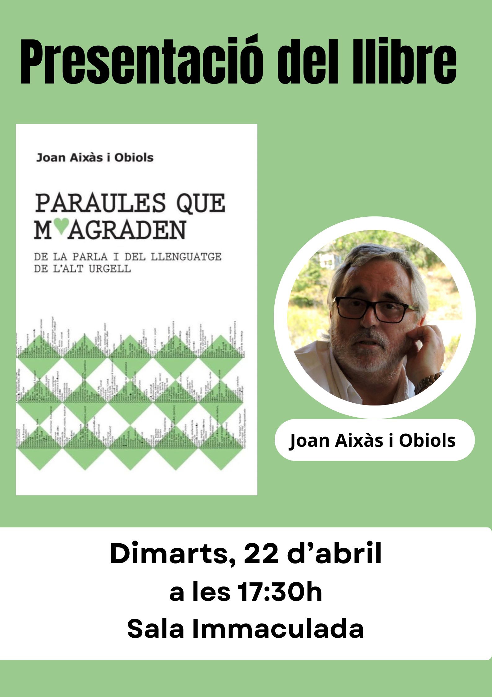 El pròxim dimarts 22 d’abril a les 17:30 h en Joan Aixàs farà la presentació del seu llibre “Paraules que m’agraden” a la Sala Immaculada de la Seu d’Urgell.