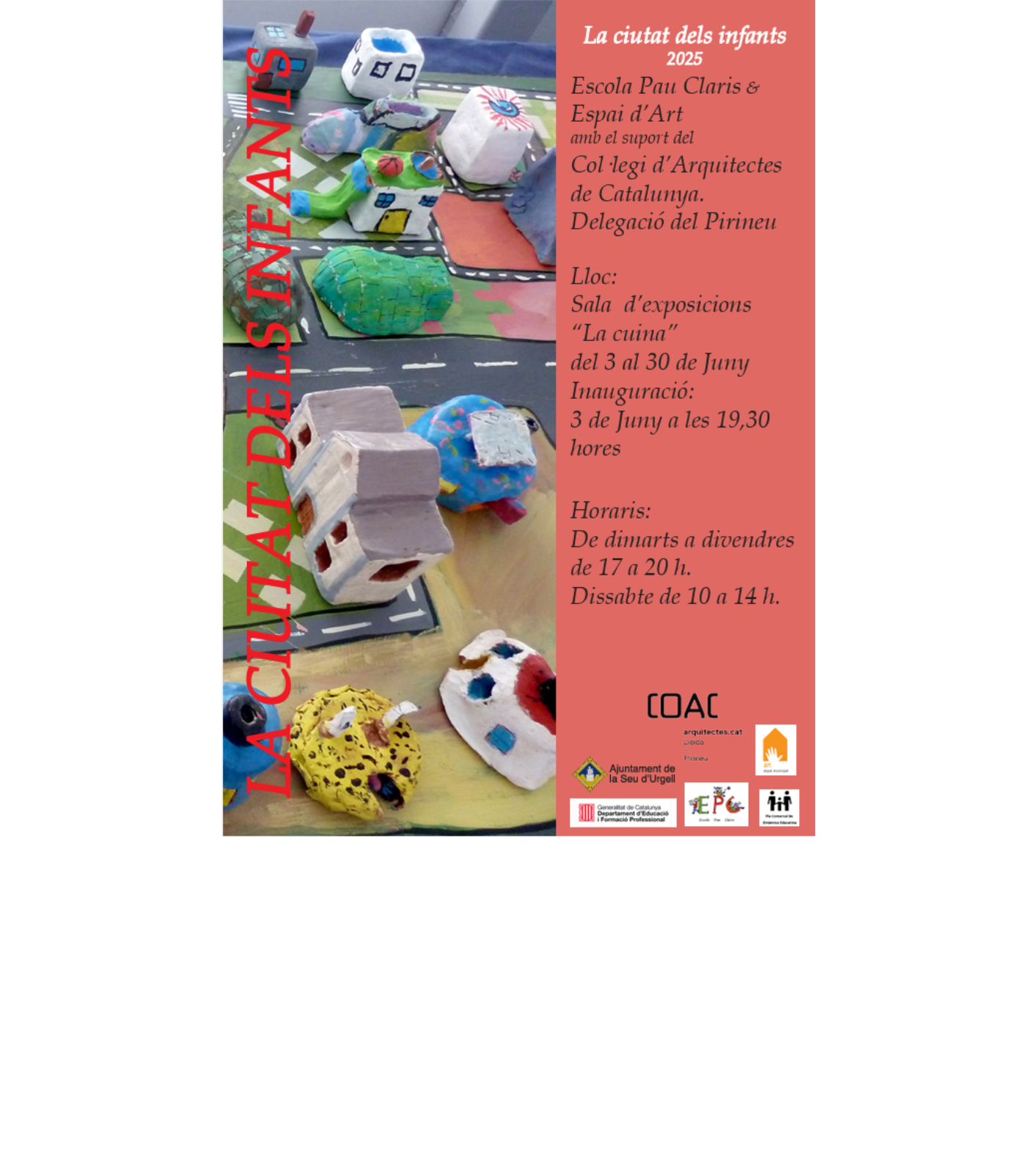 El pròxim dimarts 3 de juny a les 19.30 h s’inaugura l’exposició La ciutat dels Infants a la Sala La Cuina, un espai municipal d’art de la Seu d’Urgell. La mostra recull una col·lecció de cases fetes amb fang pels alumnes de cicle mitjà de l’escola Pau Claris de la Seu i de l’Espai Municipal d’Art.