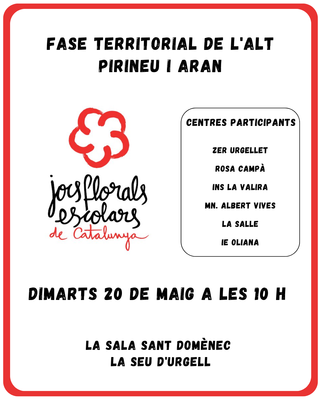 El pròxim dimarts 20 de maig a les 10 h, la Sala Sant Domènec de la Seu d’Urgell acollirà l’acte de lliurament de premis de la fase territorial de l’Alt Pirineu i Aran.