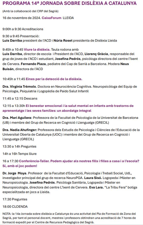 El pròxim dia 16 de novembre d’enguany tindrà lloc la 14a JORNADA SOBRE DISLÈXIA a CATALUNYA, al CaixaForum de Lleida.