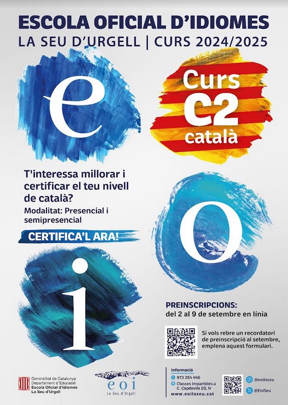L’EOI de la Seu d’Urgell oferirà cursos presencials i semipresencials de C2 de català. La preinscripció tindrà lloc a partir de les 12h del 2 de setembre de 2024 i fins a les 15h del 9 de setembre. Accés a l’aplicatiu de preinscripció AQUÍ.