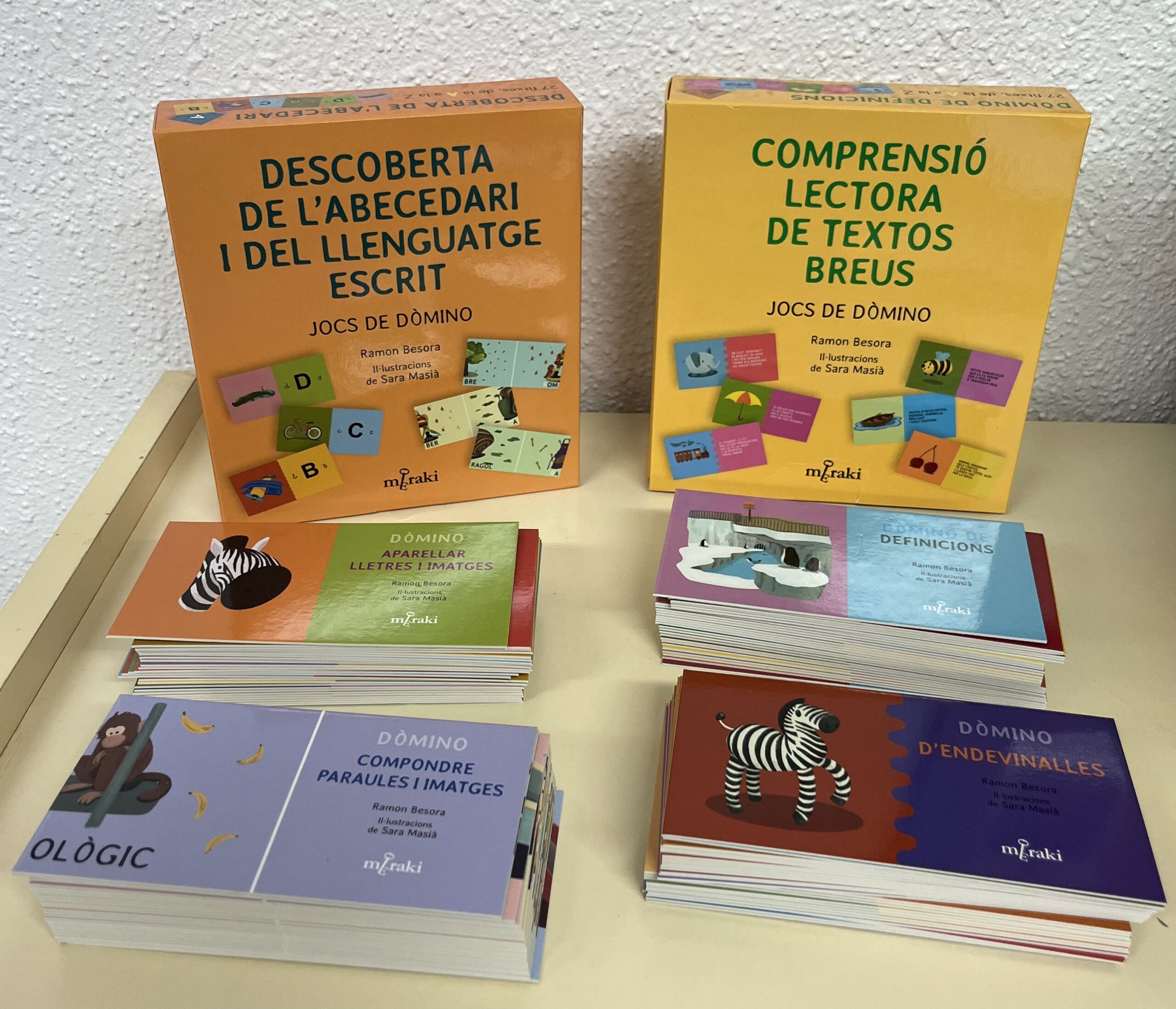 Hem adquirit dos jocs per préstec. Els jocs tenen format de dòmino per treballar la comprensió lectora de textos breus i la descoberta de l’abecedari i del llenguatge escrit amb l’autoria de Ramon Besora i les Il·lustracions de Sara Masià.