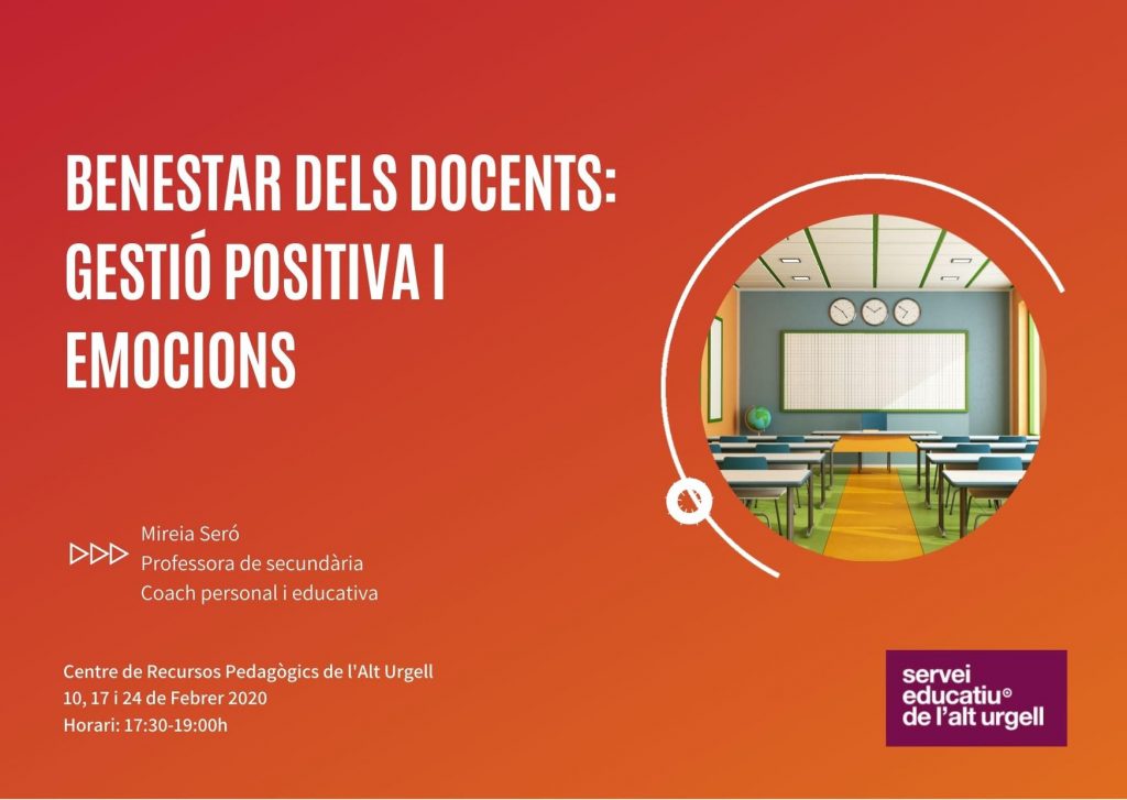 Descripció   Aquesta formació us ajudarà a transitar millor les dificultats que presenta el curs actual i poder connectar amb un major grau de benestar i positivitat. Els docents necessitem una nova mirada, més recursos i noves eines, tant per a nosaltres com també per a transmetre-ho al nostre alumnat.