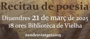 Com cada an, eth Musèu de Vielha, es bibliotèques de Vielha e Salardú e er Archiu Generau d’Aran, amassa damb es tecnics de Cultura, organizen un recitau de poesia en motiu deth Dia Mondiau dera Poesia, eth 21 de març, que se hestejarà as 18:00 ores ena Bibliotèca de Vielha.