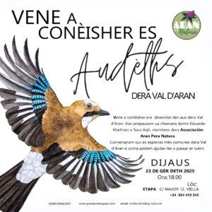 Vene a conéisher es audèths dera Val d’Aran admin21/01/25 Aran pera Natura mos aufrís aguesta charrada gratuïta, damb Eduardo Martínez e Sara Arjó, entà conéisher un shinhau milhor era diversitat des aus dera Val d’Aran.