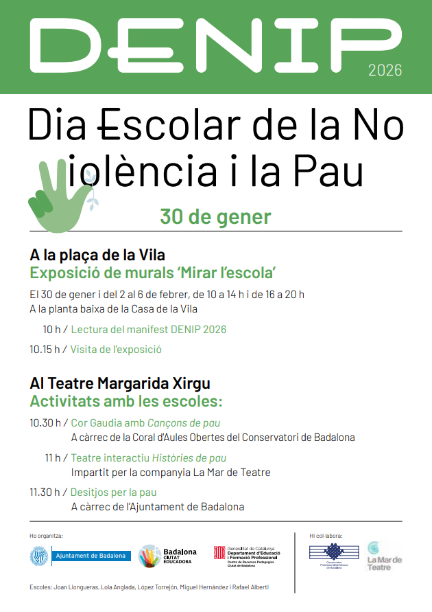 El passat divendres 30 de gener vam celebrar el Dia Escolar de la No Violència i la Pau (DENIP) a la plaça de la Vila. Aquest curs han participat de la proposta artística, proposada per la Glòria Vives i que porta per títol “Mirar l’escola” més de 200 infants de les escoles Joan Llongueras, Lola Anglada, López Torrejon, Miguel Hernández i l’IE Rafael Alberti.