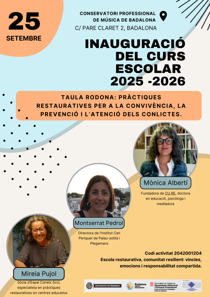 L’acte s’iniciarà amb la inauguració del curs, la presentació del Pla de Formació de Zona i de la Guia d’activitats educatives 25-26 i finalitzarà amb el diàleg “Pràctiques restauratives per a la convivència, la prevenció i l’atenció dels conflictes” amb la participació de Mònica Albertí, fundadora de CU.RE, doctora en educació, psicòloga i mediadora; Montserrat Pedrol, directora de l’Institut Can Periquet de Palau-solità i Plegamans; i Mireia Pujol, sòcia d’Espai Coneix Sccl, especialista en pràctiques restauratives en centres educatius.