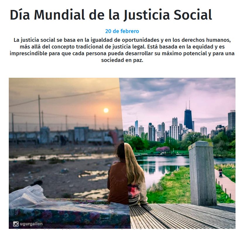 L’any 2007, l’Assemblea General de les Nacions Unides va declarar el 20 de febrer com el Dia Mundial de la Justícia Social. En aquesta declaració es reconeixia la necessitat de garantir possibilitats i resultats equitatius per a tothom fent referència als aspectes econòmics i socials.