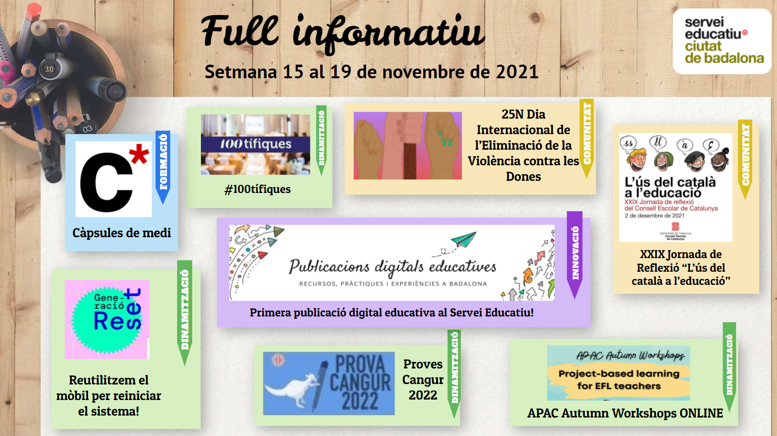 Aquestes són les notícies publicades al web del Servei Educatiu de Badalona d’aquesta setmana. Clica aquí per poder accedir a la informació de les diferents notícies. Esperem que siguin del teu interès.