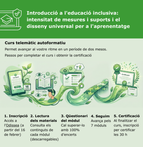 El proper 16 de febrer s’inicia el nou curs auto formatiu: Introducció a l’educació inclusiva: intensitat de mesures i suports i disseny universal per a l’aprenentatge, una formació en línia de 30 hores. Aquest curs ofereix un recorregut estructurat i pràctic per aprofundir en els fonaments de l’educació inclusiva, amb propostes orientades a la reflexió pedagògica i a la transferència a la pràctica educativa. El format auto formatiu permet avançar de manera flexible, adaptant el ritme d’aprenentatge a les necessitats de cada participant.