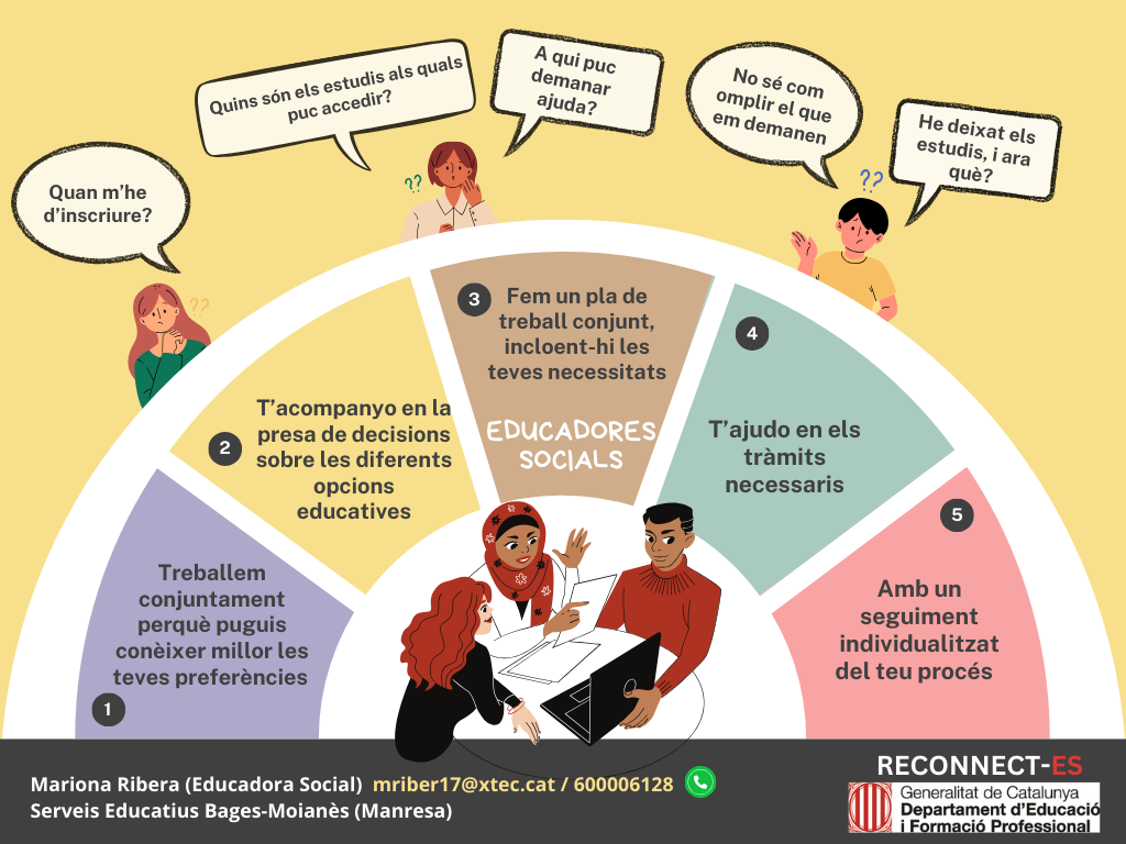 El projecte Reconnect-ES és una iniciativa del Departament d’Educació i Formació Professional de la Generalitat de Catalunya que té com objectiu acompanyar a joves d’entre 16 i 24 anys que no han assolit l’ESO o que tot i haver-la assolit, no han continuat els seus estudis.