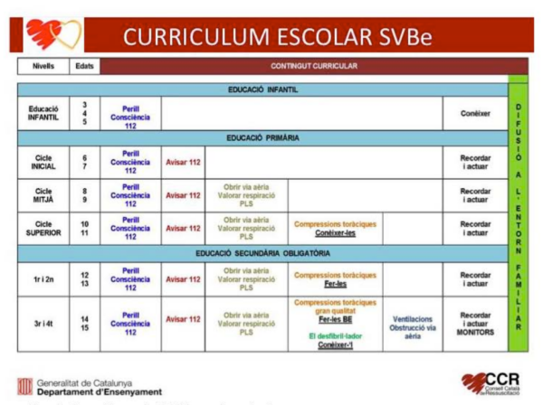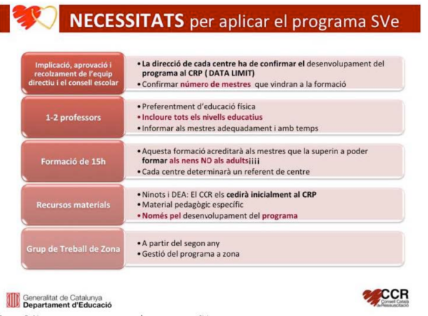 Una RCP realitzada correctament aconsegueix una supervivència 20 vegades més gran que quan es realitza de manera incorrecta. Per tant la formació de la ciutadania és una necessitat si volem assolir una millora en les taxes de supervivència amb qualitat de les víctimes de mort sobtada. La formació dels escolars, futurs ciutadans, és un dels objectius que el Departament d’Educació, amb la col·laboració del Consell Català de Ressuscitació (CCR) té el compromís de fer-ho possible. És per això que els centres adherits al programa han de donar compliment a les següents necessitats: