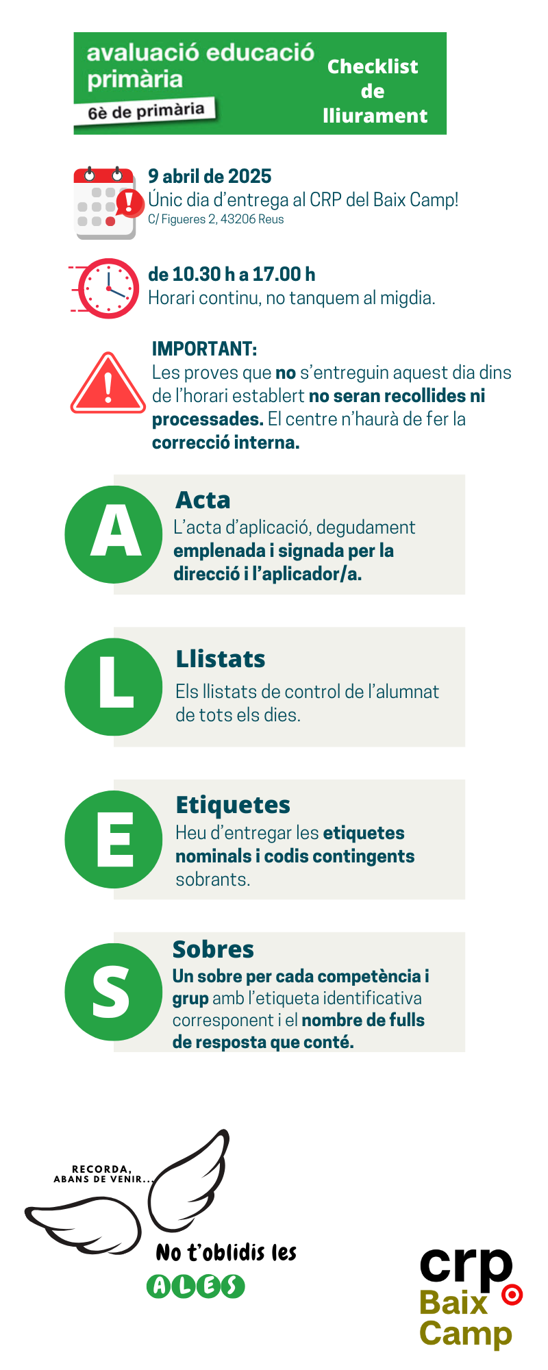 Els propers 7, 8 i 9 d’abril de 2025 el Consell Superior d’Avaluació del Sistema Educatiu ha programat per al curs la prova d’avaluació​ de sisè curs de l’educació primària. La prova està dissenyada per mesurar l’assoliment de competències i coneixements per part de l’alumnat al final de l’etapa d’educació primària.