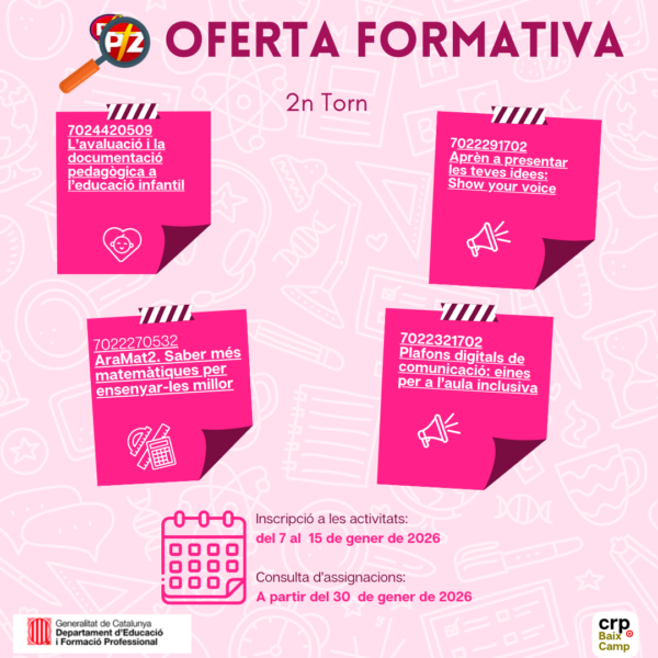 Formació de segon torn Feu un comentari / Per Equip CRP Baix Camp / 10/12/2025 / Formació professorat General Matemàtiques Pedagogia Portada Recursos Formació PFZ Benvolgudes, benvolguts, Ja teniu a la vostra disposició l’oferta formativa de segon torn. Les inscripcions s’obriran del dia 7 de gener de 2026 al 15 de gener de 2026. Us hi esperem!