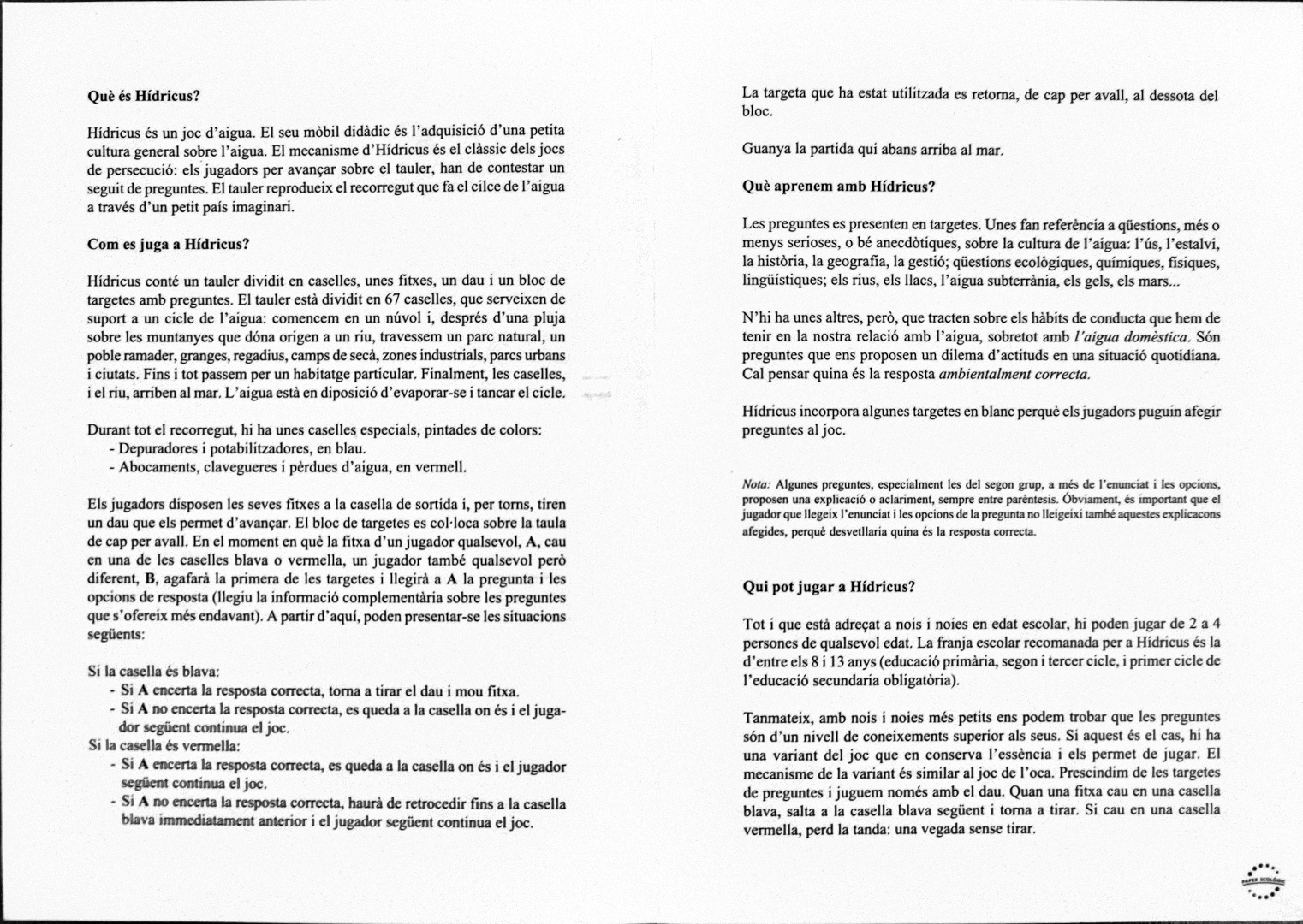 El tauler reprodueix el recorregut que fa el cicle de l’aigua a través d’un petit país imaginari i el mecanisme és el clàssic dels jocs de persecució: els jugadors han de contestar un seguit de preguntes que es presenten en cartes per avançar sobre el tauler.