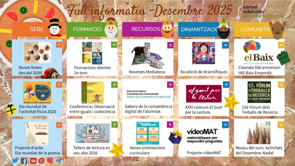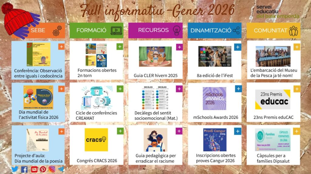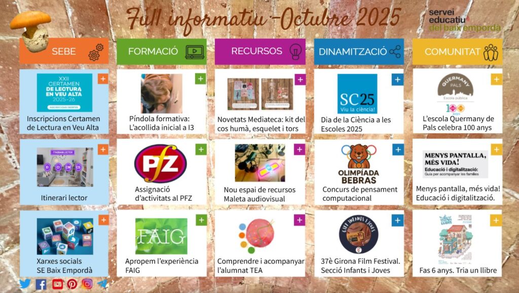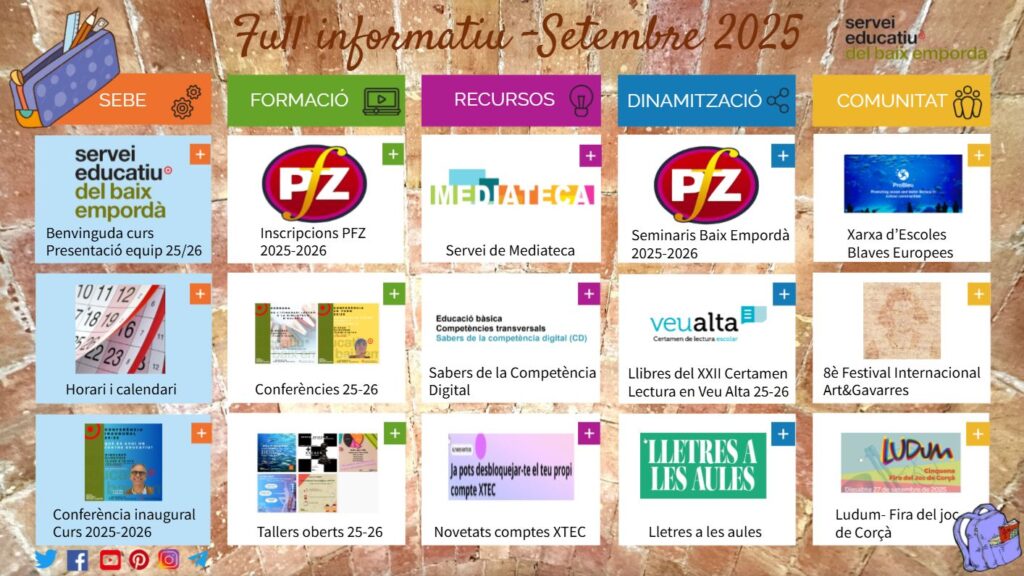 Benvolgudes docents, Benvolguts docents, Hem fet difusió de les activitats del Pla de Formació de Zona del Baix Empordà d’aquest curs, 2025-2026, a través de les xarxes socials, la nostra web i correus directes. Us recordem que les inscripcions estan obertes des del dia 5 de setembre i fins el dia 21. Trobareu totes