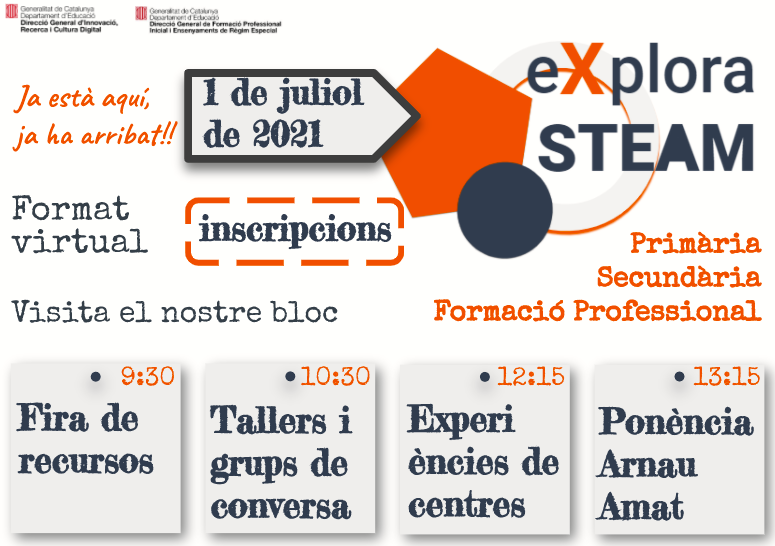 El proper dijous 1 de juliol es durà a terme la 3a edició de la jornada eXploraSTEAM, enguany virtual. Es tracta d’un esdeveniment per conèixer els recursos STEAM del territori, les experiències STEAM dels centres, i compartir tallers i debats. L’eXploraSTEAM ’21, s’adreça a tots els centres de Catalunya, als docents de Infantil-Primària, Secundària i Formació Professional i a […]