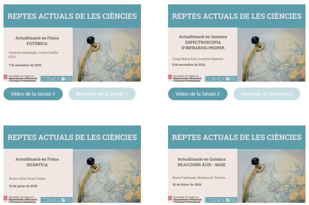 En el següent enllaç trobareu els materials i els vídeos del cicle de conferències Reptes actuals de les ciències. Física i Química. 2025-2026 que es durà a terme pel CESIRE aquest curs. Aquestes conferències serveixen per a conèixer alguns dels últims avenços de la ciència i per inspirar contextos per dissenyar situacions d’aprenentatge de les