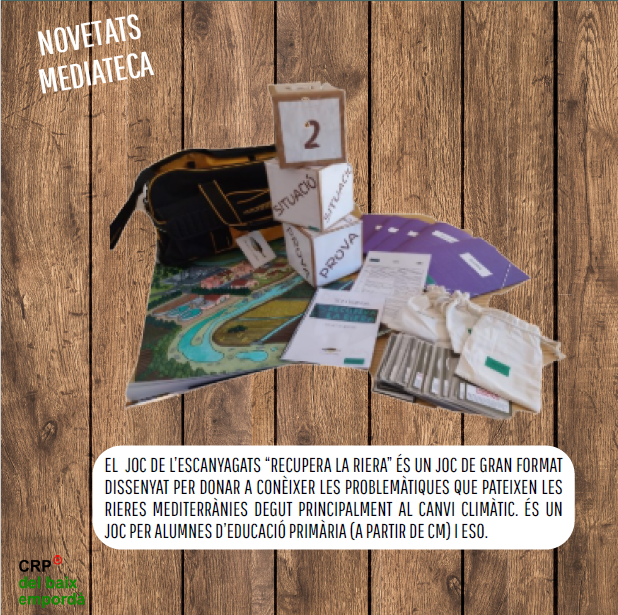 Aquest mes de desembre us presentem 4 recursos del nostre servei de mediateca: Joc de l’escanyagats: El joc de l’escanyagats “Recupera la riera” és un joc de gran format dissenyat per donar a conèixer les problemàtiques que pateixen les rieres mediterrànies degut principalment al canvi climàtic. És un joc per alumnes d’educació primària (a partir