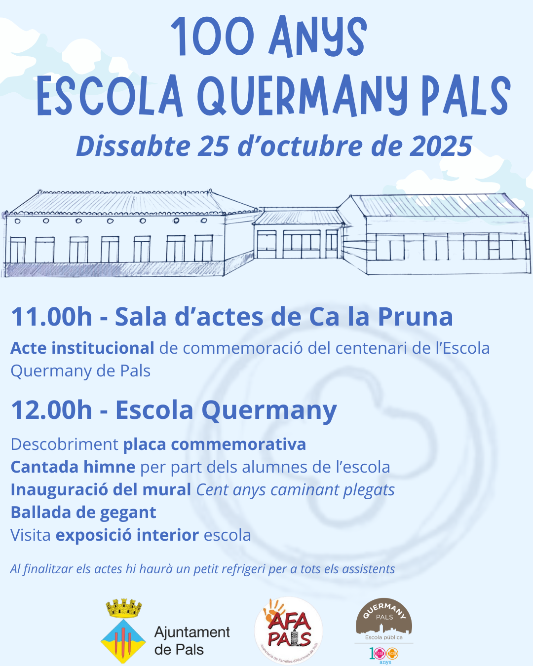 El dissabte 25 d’octubre, l’ESC Quermany de Pals celebrarà el centenari de la seva creació. Ara fa cent anys, l’empresari surer Josep Torres Jonama va construir l’escola de Pals, juntament amb les escoles Torres Jonama de Mont-ras i Palafrugell, i la desapareguda escola de Regencós.
