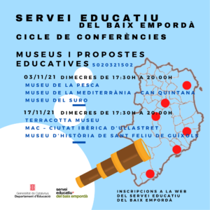 Els propers dimecres 3 i 17 de novembre, el Servei Educatiu del Baix Empordà us ofereix un cicle de conferències Museus i propostes educatives on els museus públics de la comarca ens mostraran les seves propostes educatives per a tot l’alumnat. Les sessions es duran a terme virtualment (l’enllaç us serà enviat per correu electrònic al llarg del matí de la videoconferència) de 17.30h a 20h i cal inscripció prèvia al següent enllaç. Els participants en les dues sessions podran certificar 5 hores de formació com a assistents.