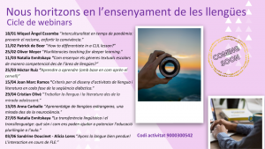 Us interessen la interculturalitat, les pluriliteracies, la neurociència, el transllenguatge, els gèneres textuals, l’atenció a la diversitat? No us ho perdeu! Inscripcions obertes al cicle de webinars “Nous horitzons en l’ensenyament i l’aprenentatge de les llengües“. Per a més informació i inscripció, cliqueu el següent enllaç. Termini d’inscripció fins el 18 de gener de 2021.