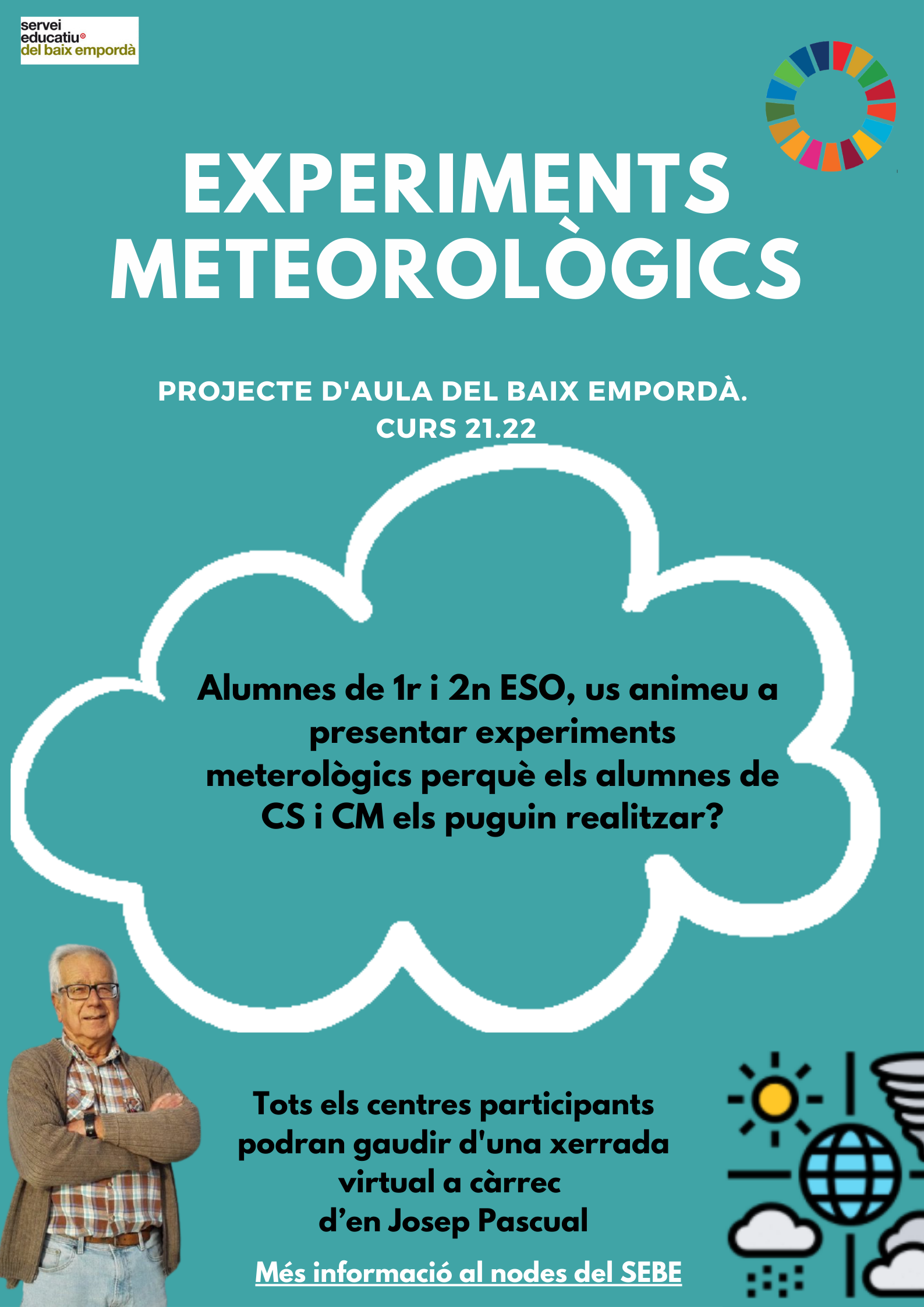 - L’objectiu és que els alumnes de 1r i 2n d’ESO ens feu arribar experiments meteorològics a través d’un petit video (format horitzontal), per tal que els alumnes de Cicle Mitjà i Superior de primària els puguin experimentar a les seves aules. Trobareu diferents experiments en aquesta presentació, però també podeu fer-ne d’altres. Us compartim aquest document on, per tal que no es dupliquin experiments entre centres, caldrà que registreu quin experiment fareu.