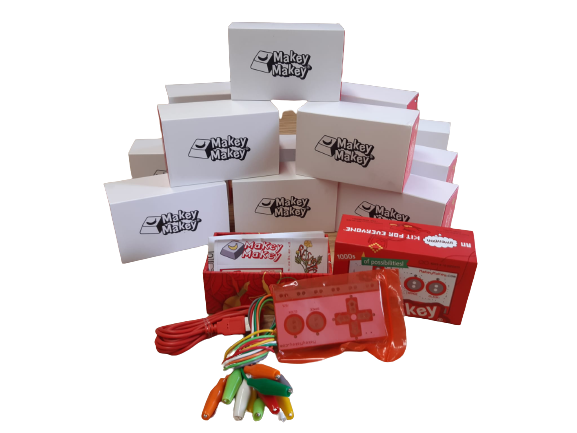 Kit format per12 unitats de Makey-Makey. Makey-Makey és una placa similar al comandament d’una videoconsola que simula ser un teclat o una rata, i permet enviar ordres a l’ordinador al qual es troba connectat. La idea de Makey-Makey és senzilla i simple, consisteix en una placa electrònica basada en Arduino amb un cable USB que es connecta a l’ordinador com un perifèric més. Makey Makey té com a objectiu iniciar als nens i nenes en el món de la programació. Guia didàctica.